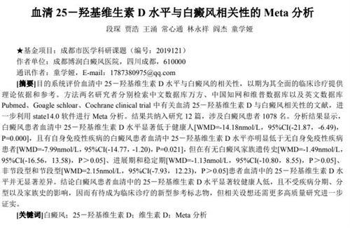 日前,由我院主任童学娅、常心通及段琛、贾浩等人联合研究的成都市医学科研课题《血清25—羟基维生素D水平与白癜风相关性的Meta分析》被中国皮肤科学中文核心期刊《临床皮肤科杂志》收录。